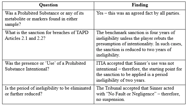 ITIA v Sinner raises a number of interesting questions and considerations in the anti-doping/integrity space in professional tennis and professional sport generally: